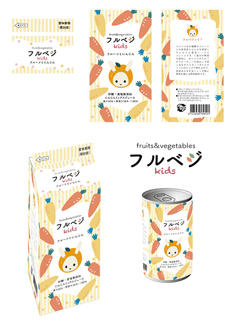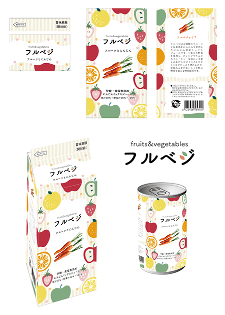 野菜ジュースのパッケージを想定して制作。大人向けのフルベジと、子供向けのフルベジkidsをデザインしました。